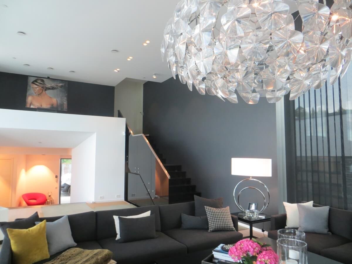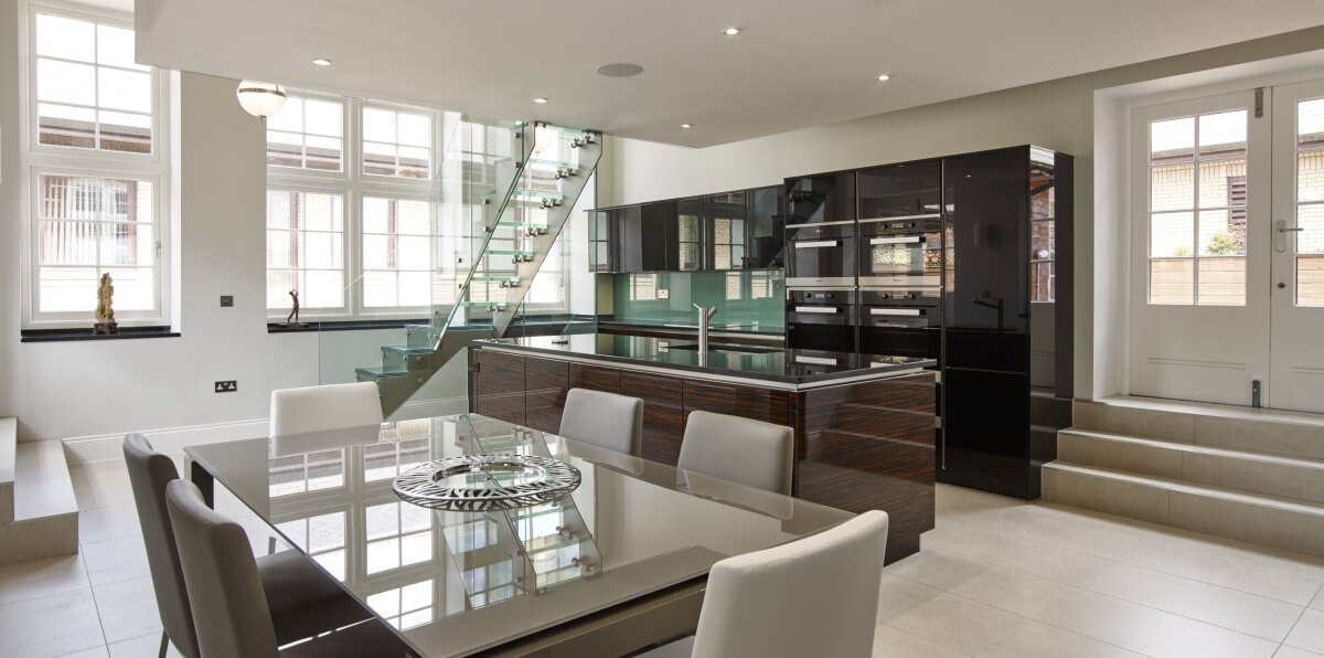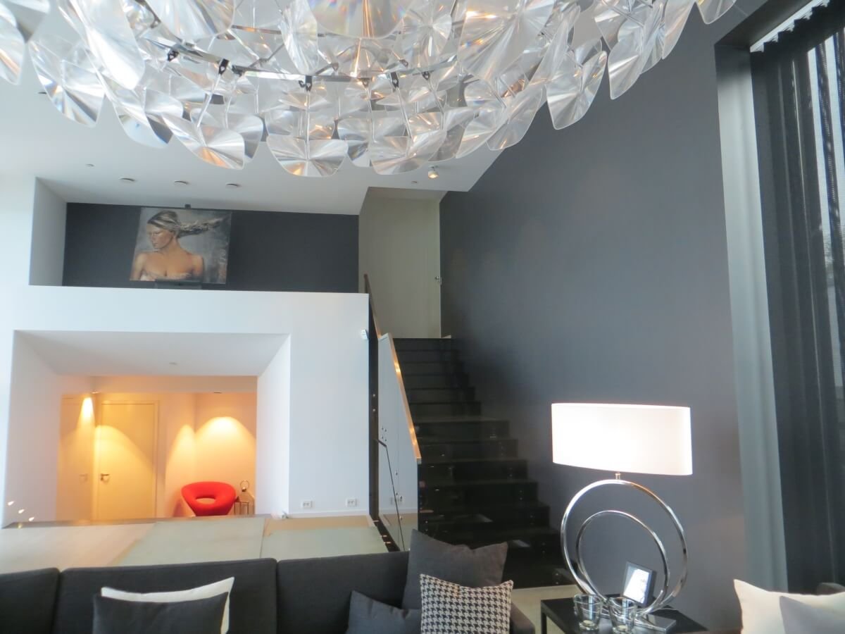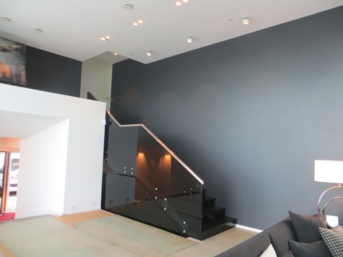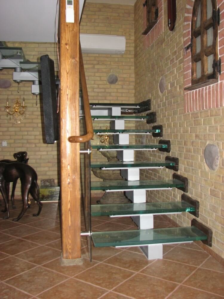 Glass – one of the most luxurious-looking interior details. Nowadays, glass stairs are made extremely carefully and after assessing the need for large weight. Tempered, laminated glass with various additional elements of metal, wood is used. Tinted, enameled glass can be used, decorated with a film or with LED lighting. For safety, the glass steps are covered with a special non-slip coating, thus the stairs acquire even more functionality.